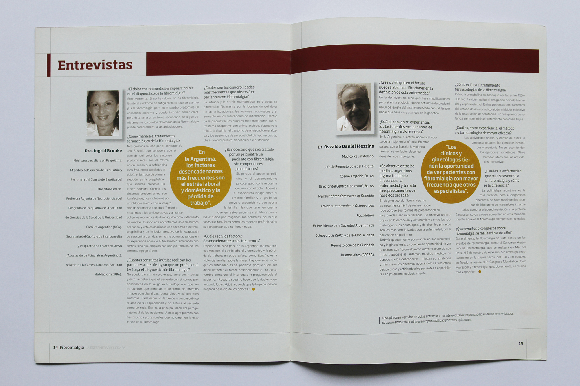 Además, incluye entrevistas a la Dra. Ingrid Brunke (Médica especialista en Psiquiatría y miembro del Servicio de Psiquiatría del Hospital Alemán, CABA) y al Dr. Osvaldo Daniel Messina (Médico Reumatólogo y Jefe de Reumatología del Hospital Cosme Argerich, CABA).